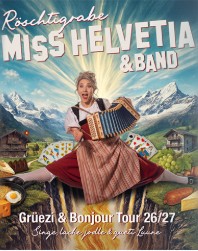 Miss Helvetia liebt das Spiel mit den Grenzen so sehr, dass sie ihnen mit “Röschtigrabe” ein neues Album und eine neue Tour widmet. Im Gepäck hat sie viele neue Songs, die sie selber komponiert hat. Lauter echte Ohrwürmer, denen sie neben dem Jodel ganz bewusst noch mehr Raum lässt als bisher. Nicht fehlen dürfen natürlich die witzigen Geschichten und Anekdoten, die zu jeder Show von Miss Helvetia gehören. Und logisch: Der Spagat wird live nicht nur im übertragenen Sinn zelebriert.