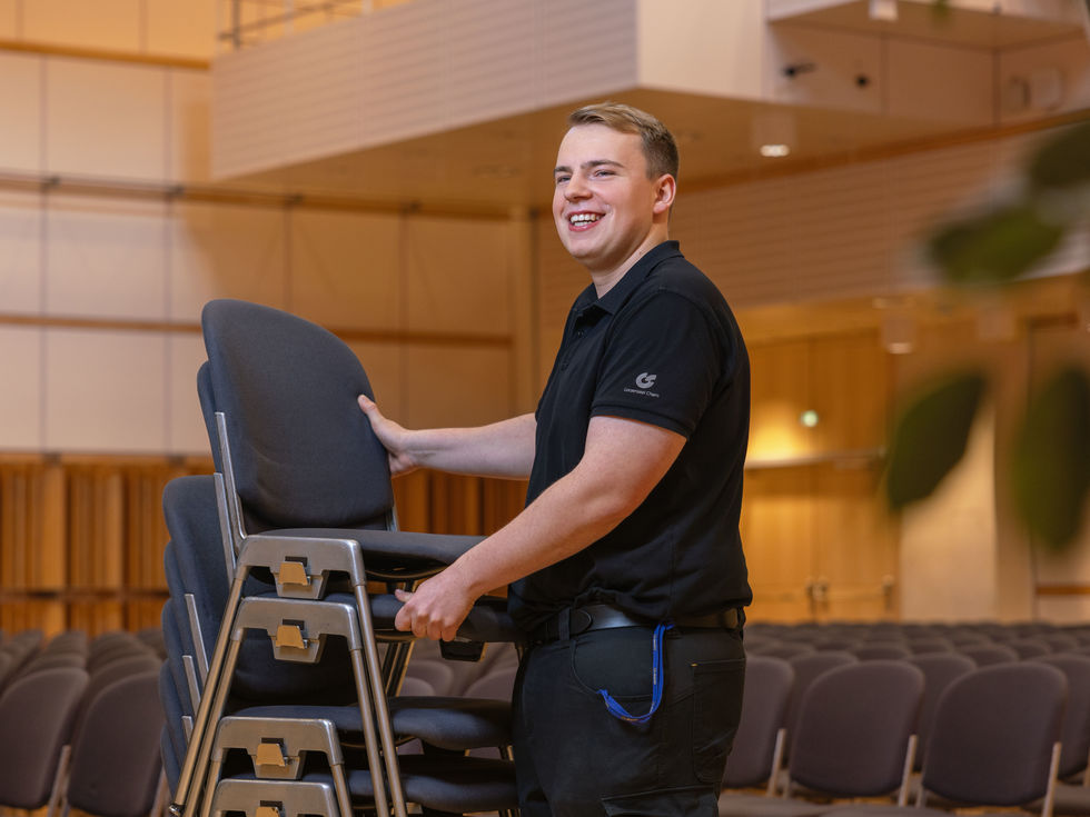 "Am Lorzensaal gefällt mir besonders das starke Team und der gute Zusammenhalt. Ich schätze die Zusammenarbeit sehr und finde es spannend, wie vielseitig der Saal genutzt wird. Kein Tag ist gleich, und genau das macht die Arbeit abwechslungsreich. Gemeinsam im Team tragen wir dazu bei, dass die Events gut vorbereitet sind und für die Kundinnen und Kunden reibungslos durchgeführt werden können."